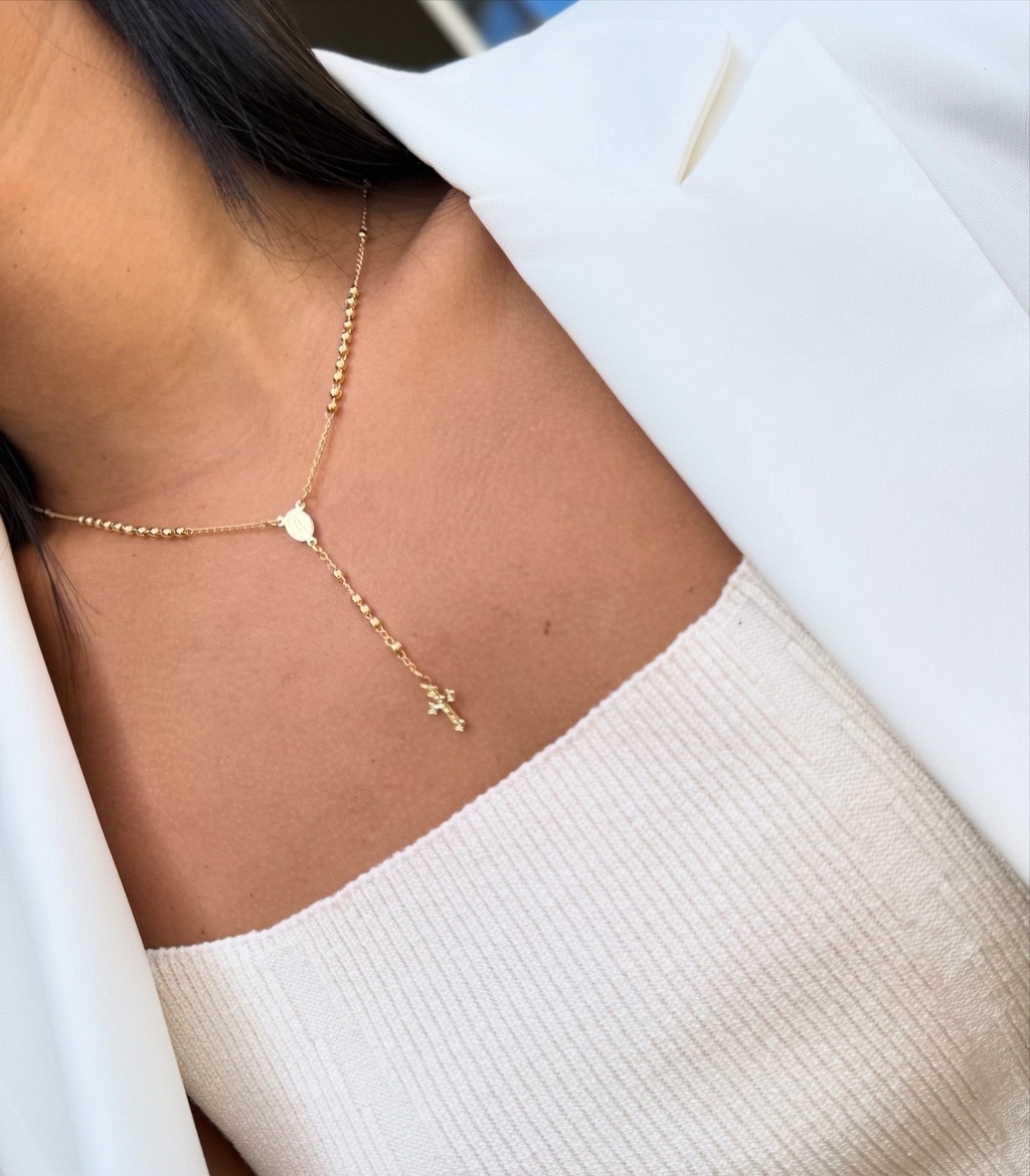 Conheça o Colar Terço! Este colar em forma de terço um design elegante e delicado, ele traz uma espiritualidade única ao seu visual. Medindo aproximadamente 45 cm, é ideal para qualquer ocasião. Banhado e hipoalergênico. Terço é o presente perfeito para você ou para alguém que ama. Adicione um toque de fé e estilo à sua produção.